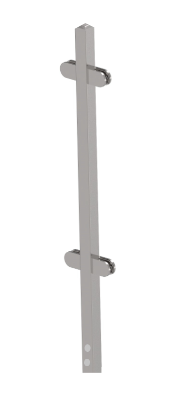 Firkant midtstolpe i rustfritt syrefast stål (AISI 316) designet for sidemontert glassrekkverk uten håndløper. Leveres komplett med glassklemmer og gummipakning for sikker og stabil montering.
